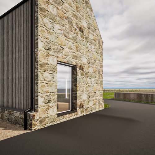 In our design, we have retained the footprint of the existing steading while incorporating elements of the original granite structure. This is harmoniously blended with a modern 1.5-storey addition, resulting in a contemporary three-bedroom detached home.
